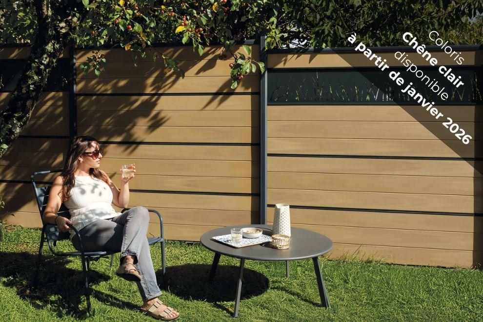 Lassen Sie sich von der Harmonie und Ästhetik dieses Sichtschutzzauns begeistern, der aus co-extrudierten Dielen besteht, eingerahmt von Pfosten und Zubehör aus Aluminium.
