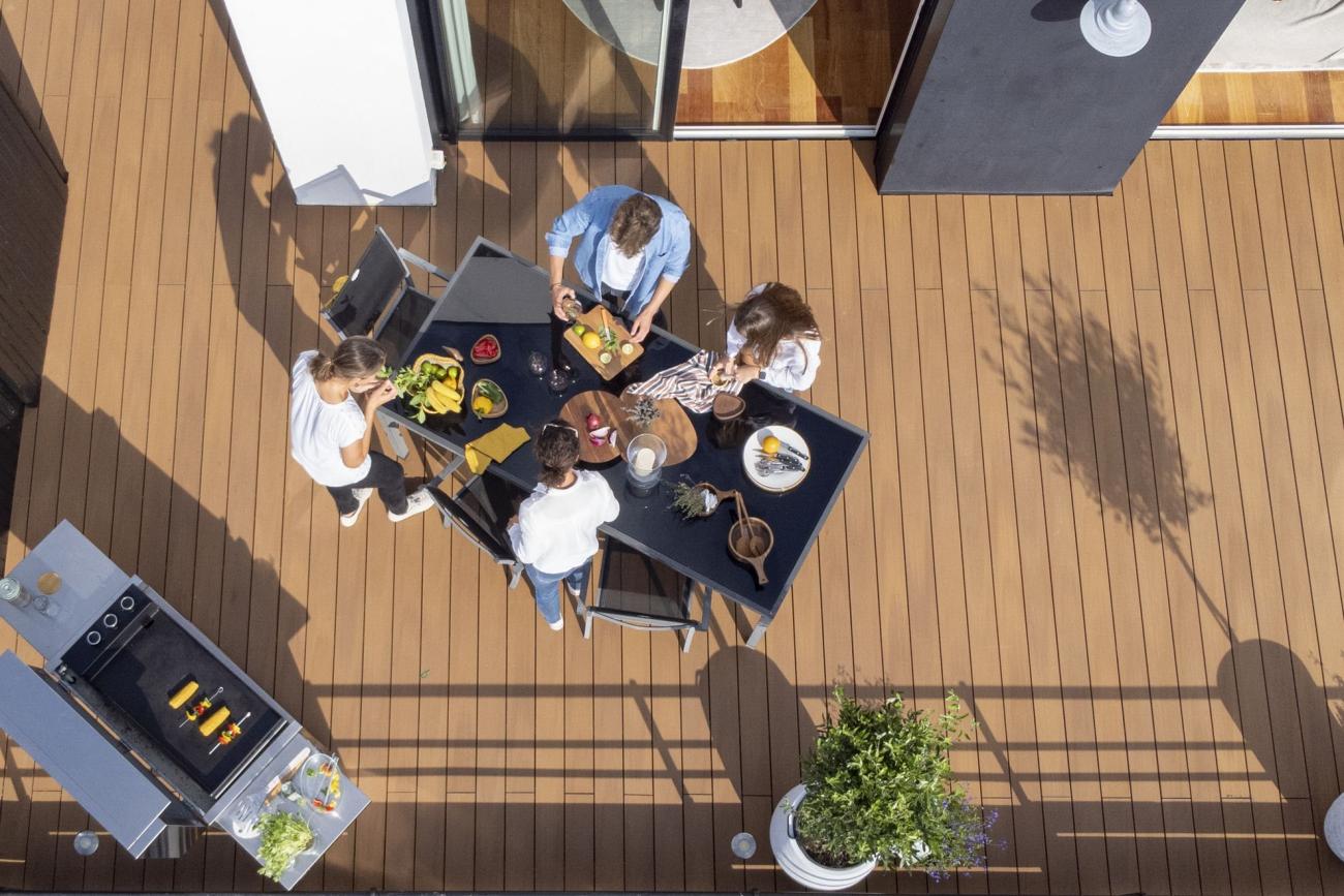 Die Diele Atmosphere eignet sich für jeden Untergrund und somit ideal zur Gestaltung von Terrassen, Belägen, Laufstegen oder Zuwegungen, ob in privaten Bereichen oder Bereichen mit Publikumsverkehr, wie Terrassen von Cafés, Hotels oder Restaurants. Flecken lassen sich kinderleicht entfernen. Somit eignet sich das Produkt für Außenküchen und ist optimal für gemütliche Mittag- und Abendessen unter freiem Himmel.