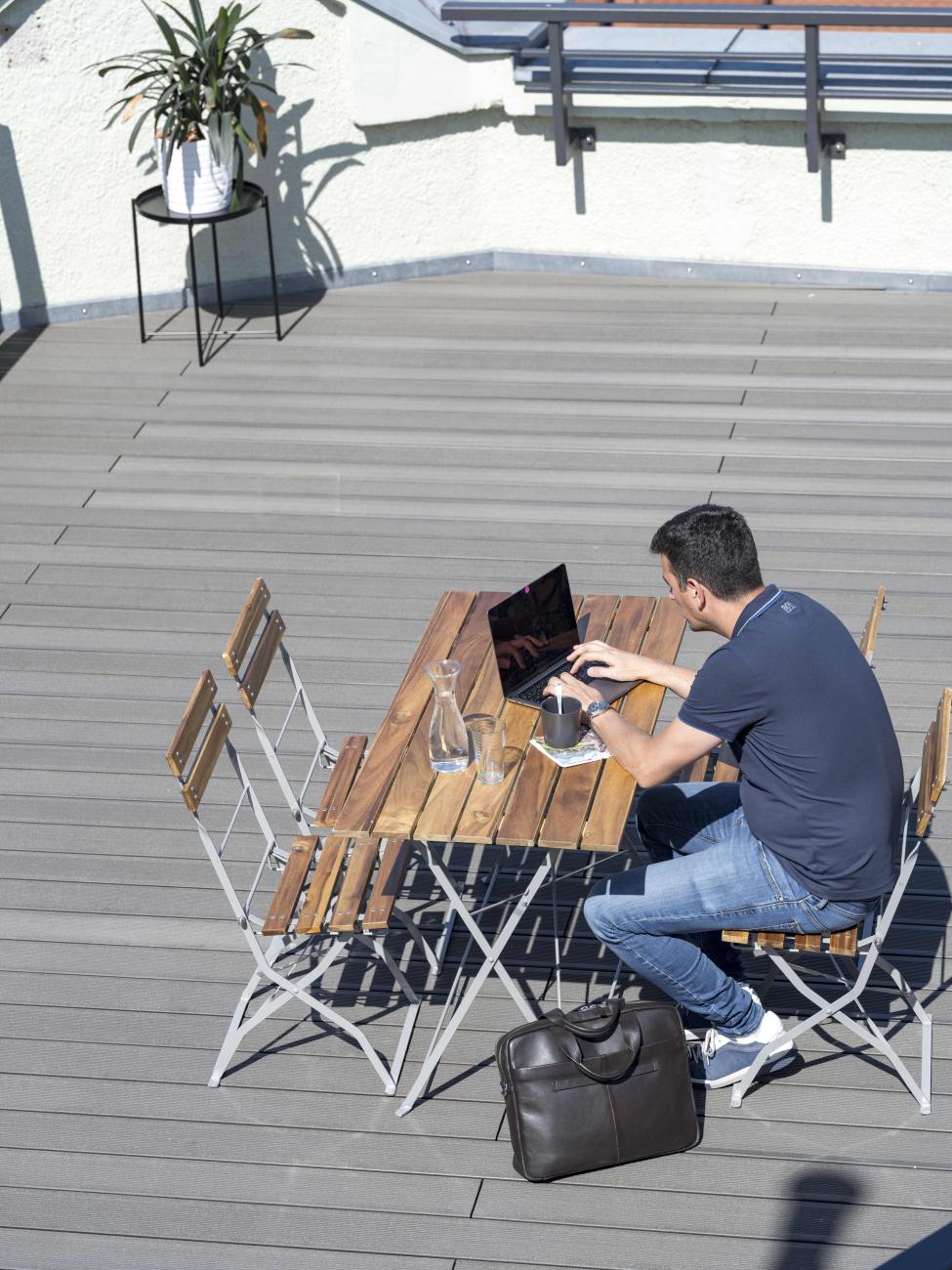 Unsere Terrassendiele Elegance gerillt kombiniert alle Eigenschaften, die man von einer traditionell genutzten Verbundholzterrasse erwartet: so ist sie äußerst rutschfest – ob barfuß oder beschuht.