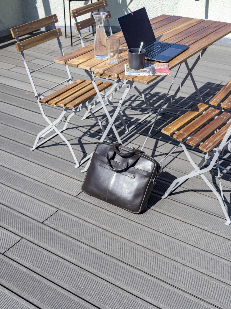 Wählen Sie die gerillten Terrassendielen Elegance, um Ihre Verbundholzterrasse, Ihre Wege und Zuwegungen zu gestalten.