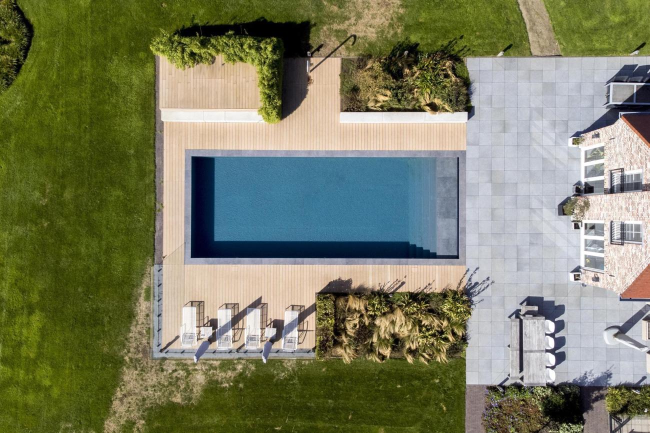 Terrasse Atmosphère brun Rio pour ce jardin de style Ibiza avec piscine